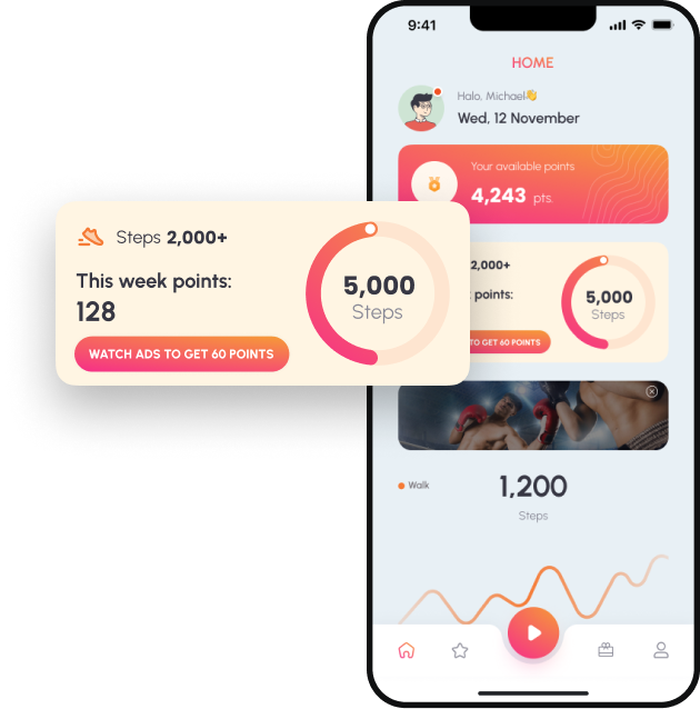 Track your steps, earn points with every move, watch ads for extra points, and redeem exciting rewards. Experience a personalized and secure fitness journey with real-time activity monitoring and account management.