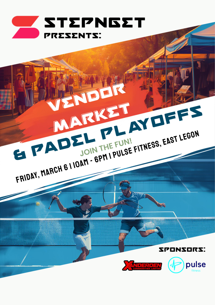 The StepNGet Padel Playoffs & Vendor Market will take place at Pulse Gym, East Legon — combining competitive padel, local vendors, and real rewards for movement.